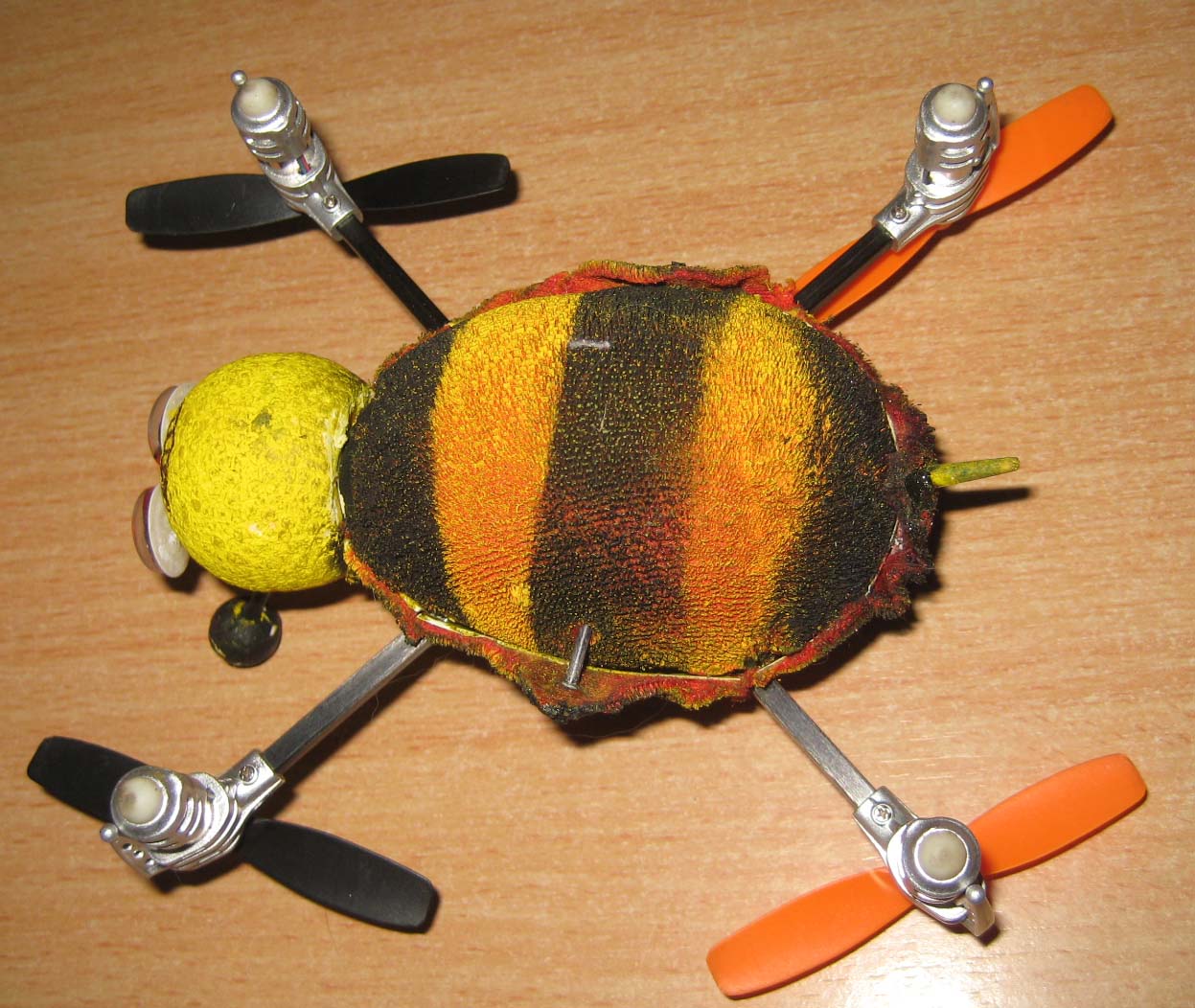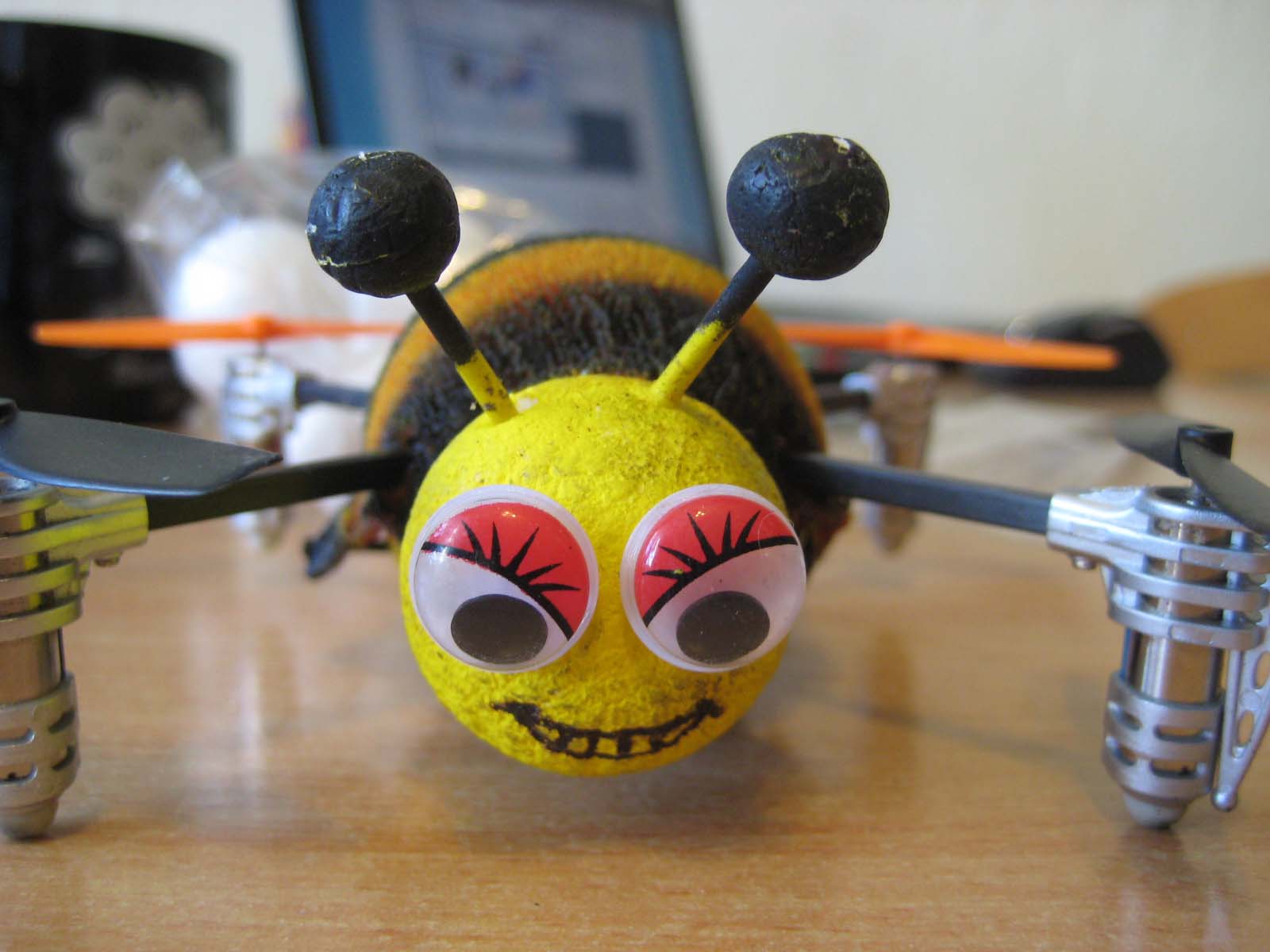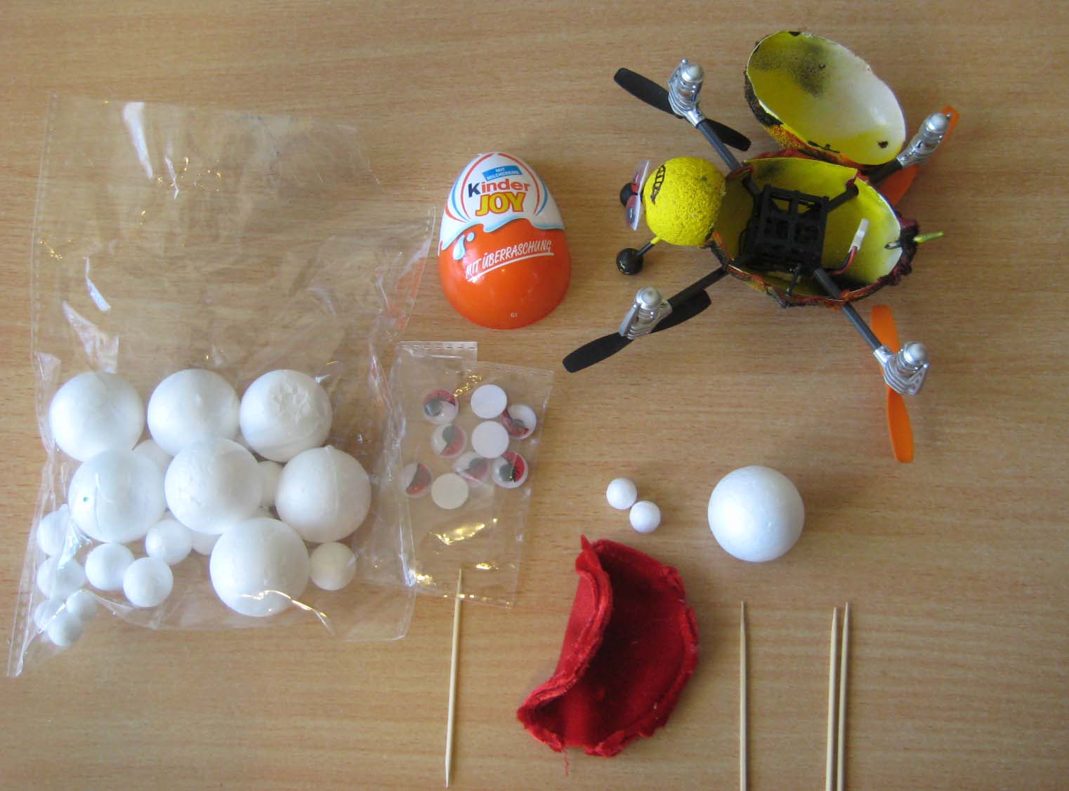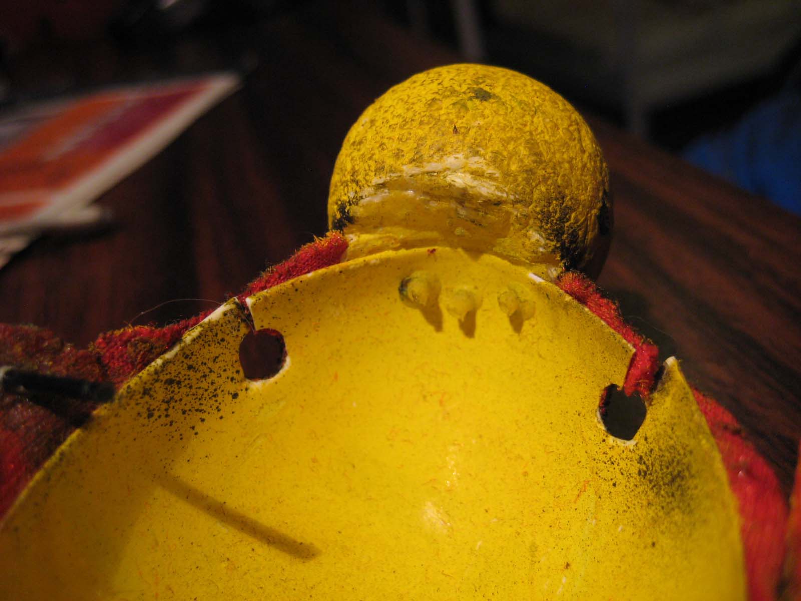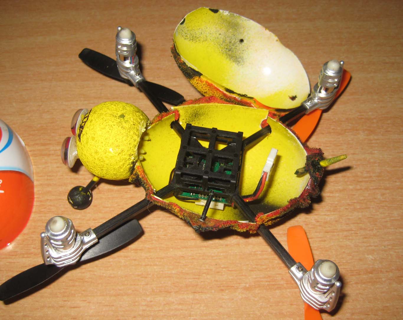 Für die Verschlüsse habe ich zunächst die Eierhälften am Copter passend zusammen gehalten und dann mit heißem Draht (Rouladennadel) die Löcher gemacht. Dann Verschlussstäbchen in den Stoff kleben (hinten gleichzeitig als Stachel)