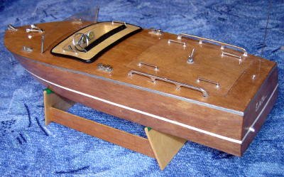In Anlehnung an die Riva-Boote ist dieser Eigenbau entstanden. Der Bauplan des Rumpfes stammt aus einem alten Modellbau-Buch, das meine Frau irgendwann mal aus den Bibliothek mitgebracht hatte. Der Beschlagsatz war von einem anderen Modell übrig und den Rest habe ich entsprechend improvisiert.
