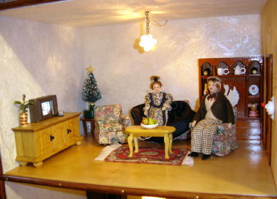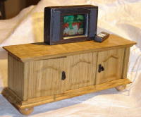 Bei einem Umbauversuch auf elektronische Ansteuerung des Auslösers der Digitalkamera (für den Flieger) ist irgend etwas schief gelaufen, sodaß der Auslöser danach ständig betätigt war. Es war mir jedoch mit etwas Geschick noch möglich, einen Trickfilm vom TV abzufilmen und den kann die Kamera abspielen. Das Gehäuse habe ich abgebaut, damit die Kamera verkehrt herum in das Schränkchen passt. Das mit einem Flachbandkabel verbundene Display habe ich nach oben umgeklappt und aus Holz ein TV-Gerät darum herum gebaut. Eingeschaltet wird der Fernseher über die Fernbedienung auf dem Schrank. Darunter verbirgt sich ein Schiebeschalter. Die Spannungsminderung von 12V (Puppenstube) auf 3V (Kamera) habe ich mit dem BEC eines alten Flugreglers und ein paar Z-Dioden erreicht.