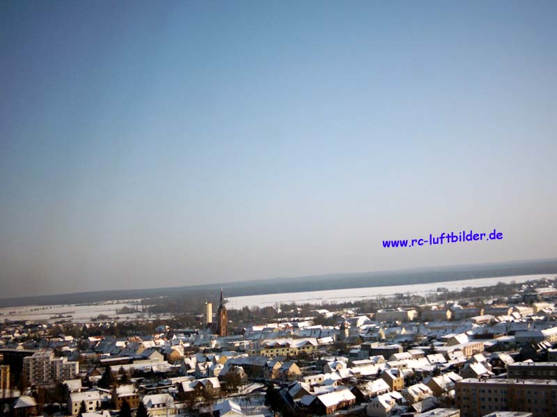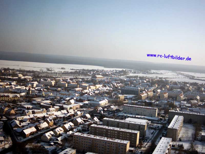 Blick auf den alten Stadtkern mit Kirche und Wasserturm. Im Vordergrund ist die Walther-Rathenau-Straße zu sehen. |