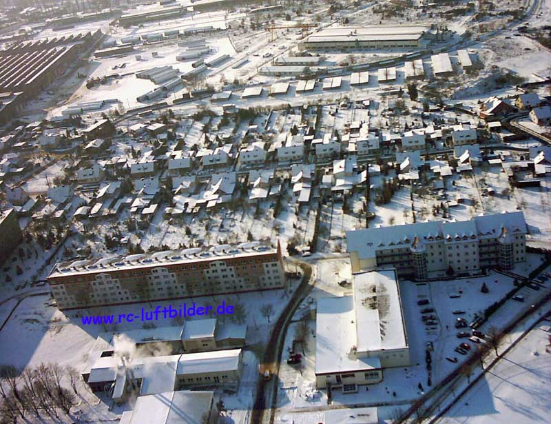vorn die Schwimmhalle und das ehemalige Sportforum und dahinter die Windmühlenstraße |